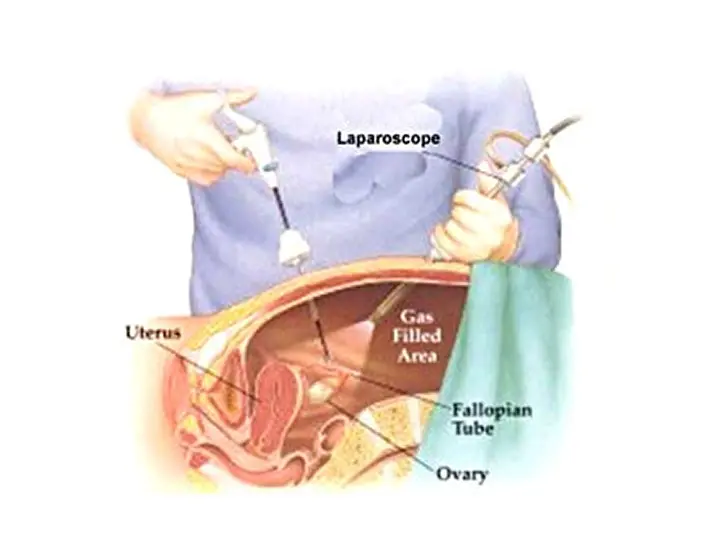 During the procedure, a small tube connected to a light source and camera is first inserted through the umbilicus. The camera then relays images of the abdomen or pelvis onto a television screen.